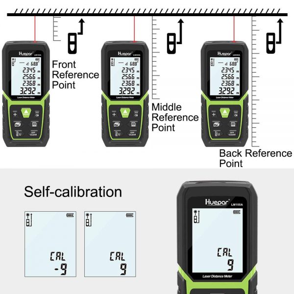 Huepar LM50A on erittäin tarkka etäisyysmittari. Etäisyysmittarilla voi mitata laitteen edestä / keskeltä / takaa, mikä helpottaa mittausta eri tilanteissa työmaalla. Kaikki mittaukset näytetään reaaliajassa.