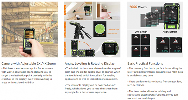 - Lasermitta kameralla Huepar LM90C on ammattilaisen etäisyysmittalaite 90 metrin kantamalla.